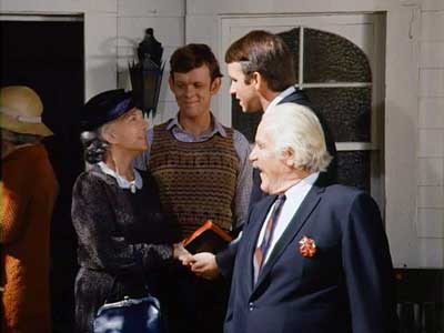 Zelda talks with Mrs. Brimmer. Zeb stops by to talk with Zelda and persuade her to come to an agreement with Esther. Just at that moment Esther walks by and sees them sitting on the porch. She continues on her way. Zelda smells a rat and stands her ground. She feels it’s time for Esther to retire as organist. Zeb chases her down just outside of Ike’s store but she doesn’t want to listen to his story. Inside, Esther smells burning hair and finds Olivia in Corabeth’s new beauty parlor getting a perm in a wild hair perming contraption. Esther says that it smells terrible. She then heads to the church where she attempts to concede her stand concerning her job as the organist. She gets heated up again and threatens to change churches and become a Methodist.