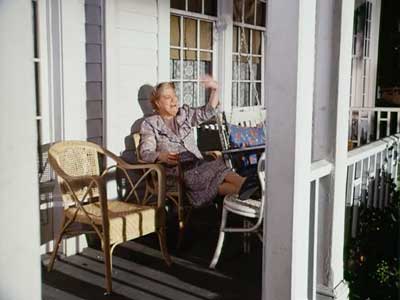 Olivia walks past Flossie Brimmer’s boarding house. Flossie waves for Olivia to join her on the porch. She is somewhat intoxicated and says that it is for the pain she feels with her raised arches.They talk for a bit but John pulls up in his truck with a suitcase packed and a plan to take Olivia to a hotel for the night. She agrees whole-heartedly and they quickly drive off for quality alone time together.