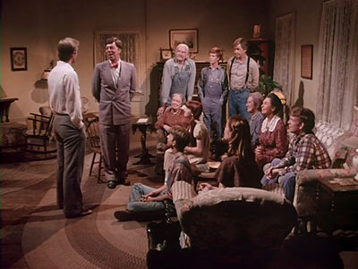 Grandpa calls him down to the living room where Ike Godsey, Mrs. Brimmer, the Baldwin sisters and members of his family present him with a certificate of appreciation for his achievement. When they ask him to describe what he saw his frustration bursts out and shocks his audience. John brings him a piece of Mrs. Brimmer’s cake and offers him some advise on how to deal with his dilemma.