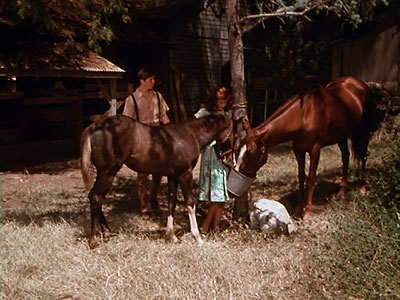 Drew arrives looking for Elizabeth who forgot that they planned to meet at the bridge before going to school. She is grooming new horses that John received from a customer who couldn’t pay his bill. Their names are Molly and Pepper. She says her Daddy is going to sell Pepper the foul when she old enough but Elizabeth can keep the mare. Drew tells her to grab her books and hurry up but she tells him to go on ahead without her.