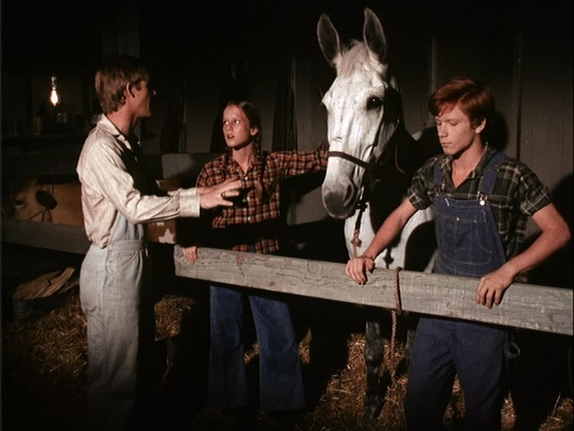 Maureen asked about Blue, the Walton mule, who she commented seemed so well trained. He was pretty chill, though I think at least two different mules played the role of "Blue". There are livestock specialists around LA who train and rent large animals to TV shows. They truck them in and "wrangle" them (that's the official Hollywood term. It would say "Mule Wrangler" on the call sheet.) Blue even joined us at the Hollywood Bowl, when the Walton kids performed Shakespeare to help raise money for Will Geer's theater, Theatricum Botanicum. Mary, David and I rode onto the stage on Blue's back. He froze solid when he saw the audience and we all had to kick like crazy and Jon had to pull hard on his rope to get Blue to move. But then he was fine.